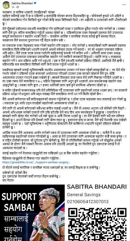 काठमाडौं : राष्ट्रिय महिला फुटबल टोलीकी कप्तान सावित्रा भण्डारी ‘साम्बा’ले आफ्नो घुँडाको जटिल शल्यक्रिया र उपचारका लागि आर्थिक सहयोगको अपिल गरेकी छन्।